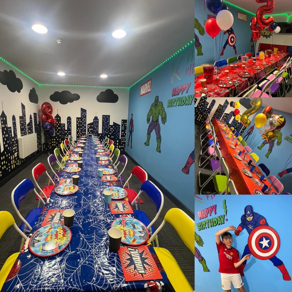 With long party tables, bright seating, and fantastic photo opportunities, it’s the ideal setting for party food, cake, and unforgettable superhero moments with friends and family.